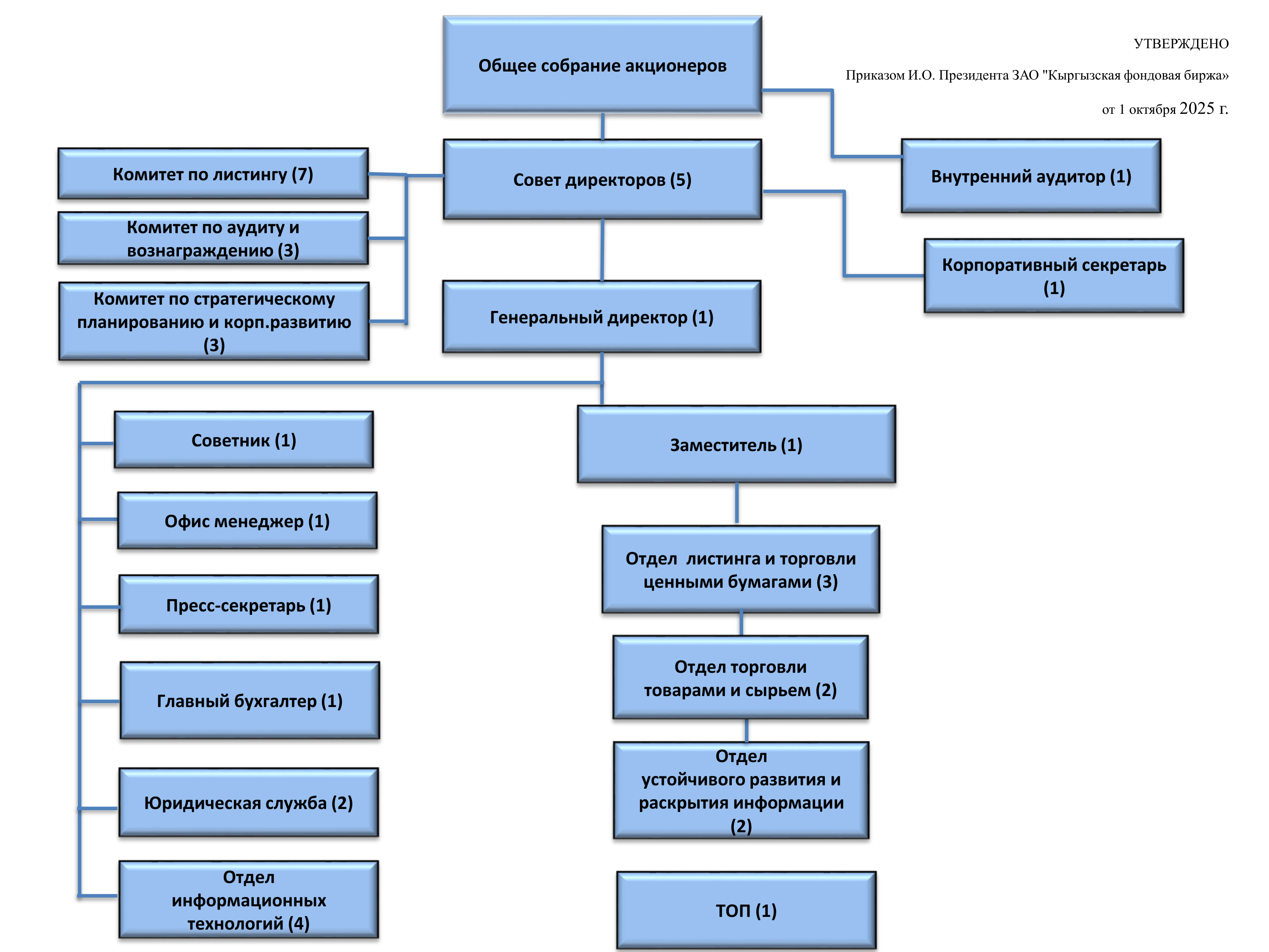 Уставом Кыргызской фондовой биржи определена исключительная компетенция Общего собрания акционеров и Совета Директоров, а также установлена компетенция Президента. Кыргызская фондовая биржа имеет следующие внутренние корпоративные документы, регулирующие деятельность его органов управления: