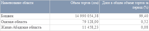 В региональном разрезе торгов, наибольшая доля объема торгов за период представлена сделками с ценными бумагами компаний, зарегистрированных в городе Бишкек: