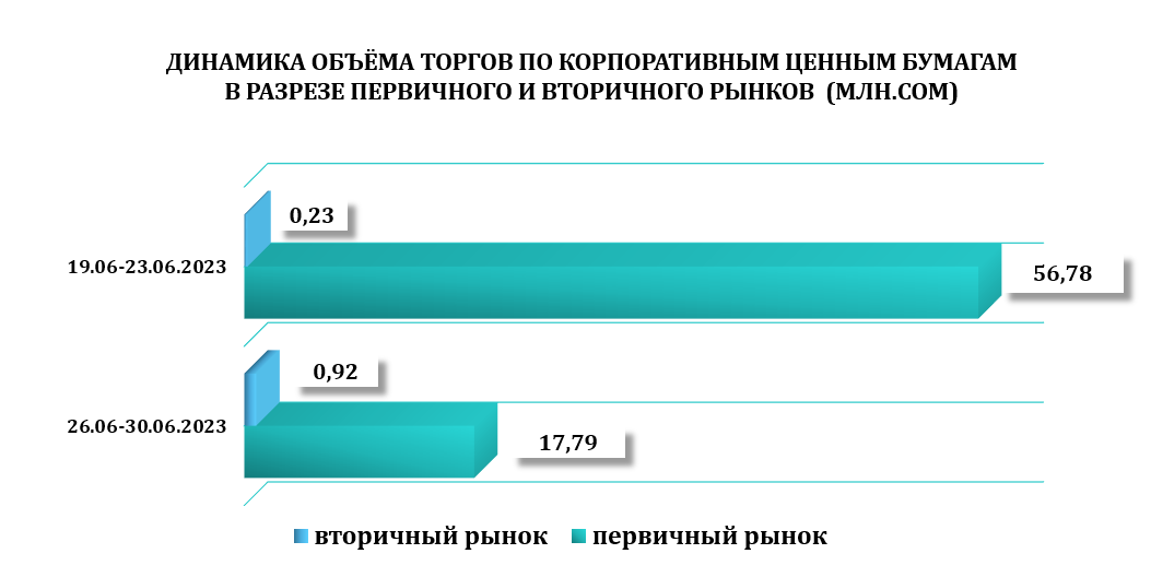 По итогам недели доля вторичного рынка заняла всего 3,94 % объёма торгов периода, все сделки были проведены на общую сумму 0,92 млн.сом.
