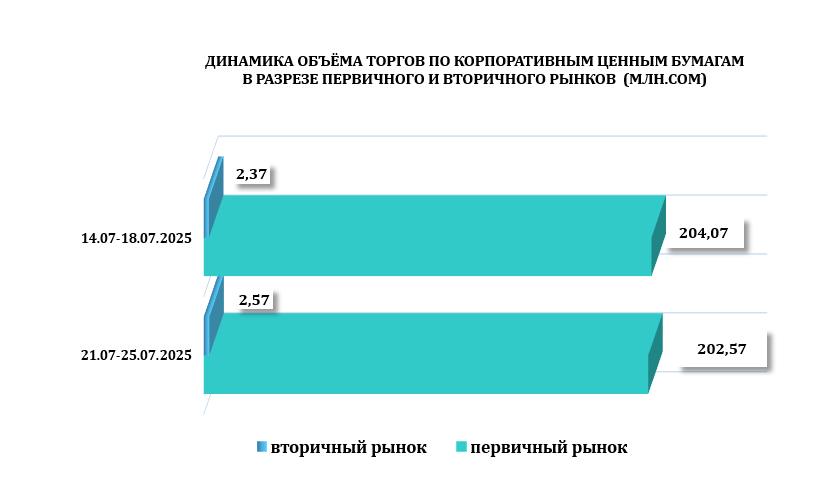 С 21 по 25 июля 2025 года общий объем торгов на торговой площадке КФБ составил 205,13 млн. сом, было зарегистрировано всего 34 сделок с корпоративными ценными бумагами, основную долю объёма торгов заняли сделки с акциями компаний 97,9 %.