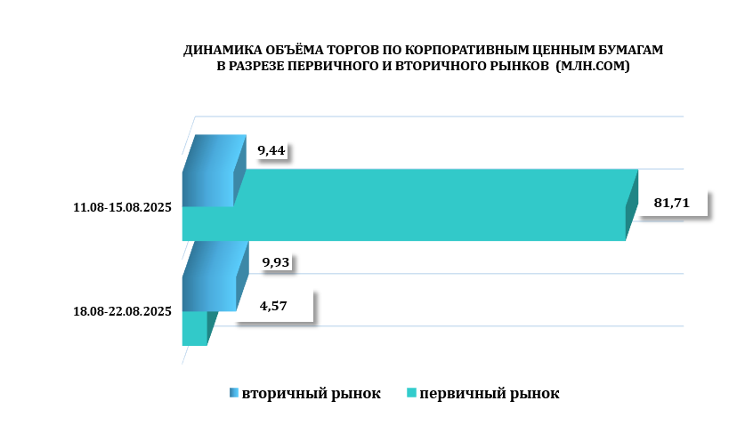 С 18 по 22 августа 2025 года общий объем торгов на торговой площадке КФБ составил 1 000,08 млн. сом, было зарегистрировано всего 66 сделок с государственными и корпоративными ценными бумагами, основную долю объёма торгов заняли сделки с государственными ценными бумагами 98.6 %.