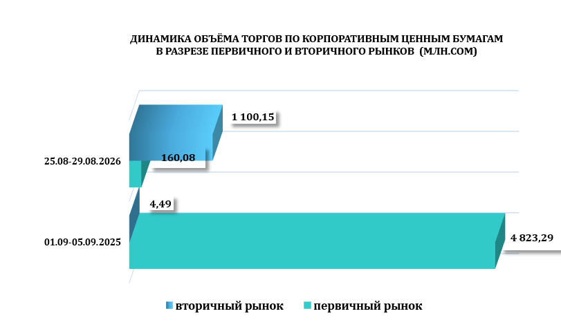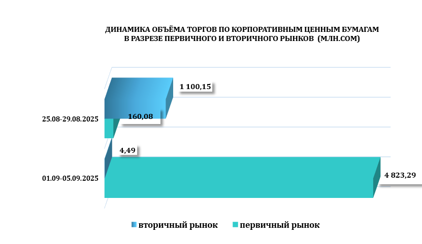 С 1 по 5 сентября 2025 года общий объем торгов на торговой площадке КФБ составил 4 827,78 млн. сом, было зарегистрировано всего 149 сделок с корпоративными ценными бумагами, основную долю объёма торгов заняли сделки с корпоративными ценными бумагами 99,9 %.
