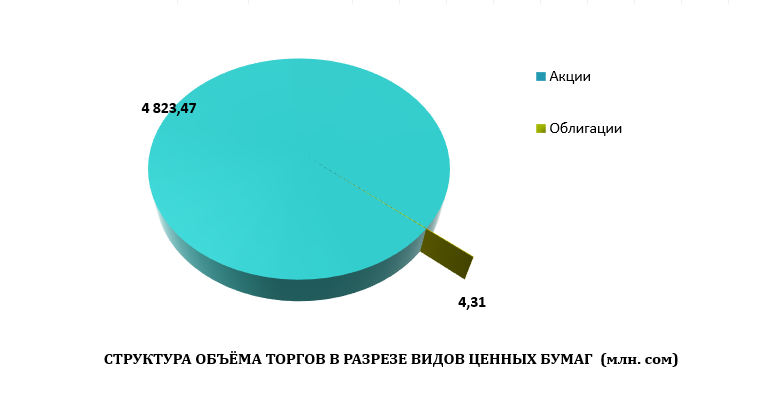 Итого торги листинговыми ценными бумагами были зафиксированы на сумму 4 676,35 млн. сом.