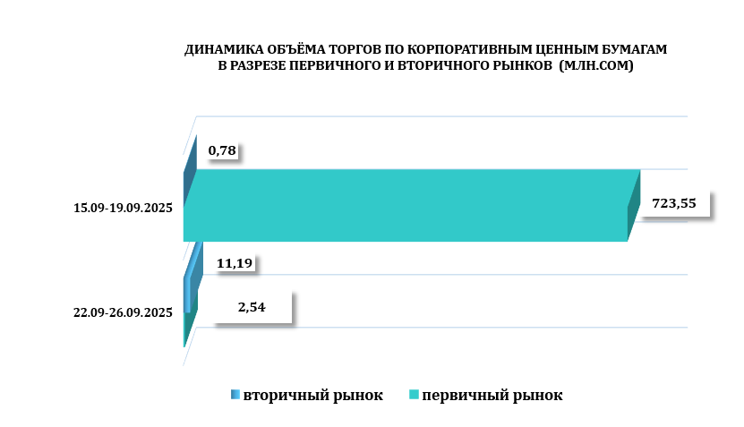 С 22 по 26 сентября 2025 года общий объем торгов на торговой площадке КФБ составил 13,73 млн. сом, было зарегистрировано всего 37 сделок с корпоративными ценными бумагами, основную долю объёма торгов заняли сделки с корпоративными облигациями компаний (97,4 %).