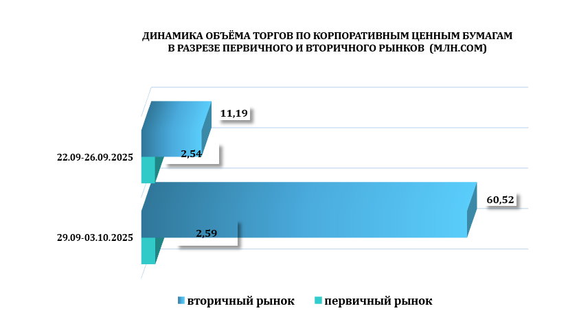 С 29 сентября по 3 октября 2025 года общий объем торгов на торговой площадке КФБ составил 63,11 млн. сом, было зарегистрировано всего 36 сделок с корпоративными ценными бумагами, основную долю объёма торгов заняли сделки с корпоративными акциями компаний ( 95,0 %).