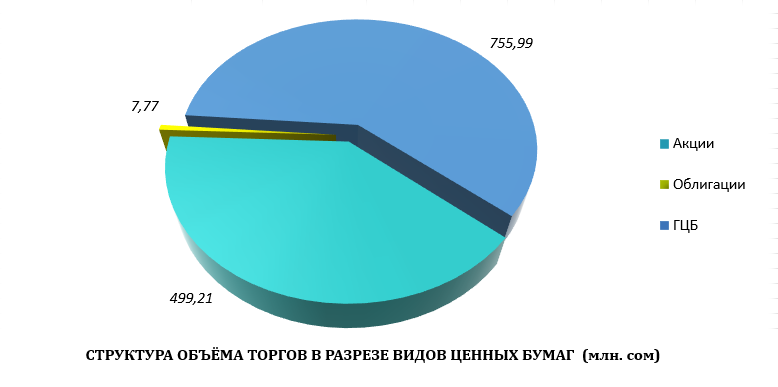 На первичном рынке зарегистрировано 4 сделок с простыми акциями компаний ОАО МКК «Фонд развития предпринимательства», ОАО «Государственный финансовый холдинг» и ОАО «Кыргызсуудолбор». Общий объём торгов с корпоративными акциями составил 496,00 млн. сом