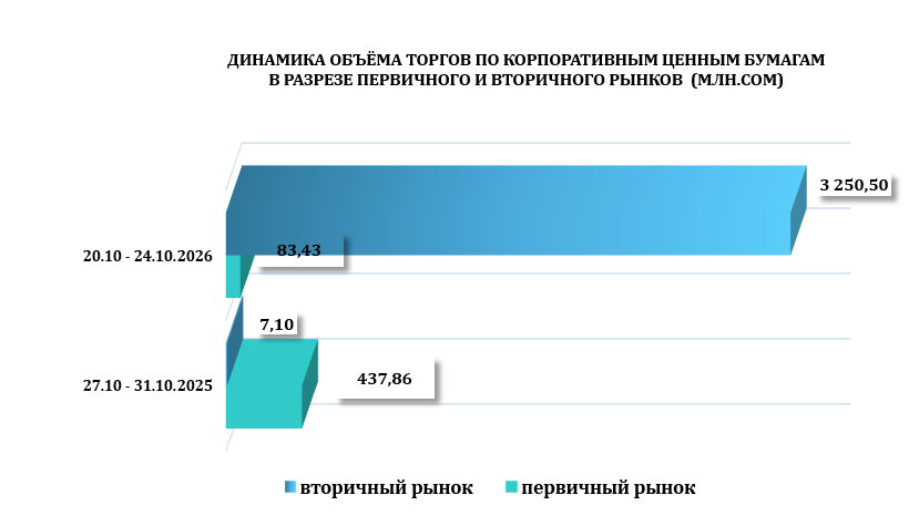С 27 по 31 октября 2025 года общий объем торгов на торговой площадке КФБ составил 444,96 млн. сом, было зарегистрировано всего 23 сделки с государственными и корпоративными ценными бумагами, основную долю объёма торгов заняли сделки с государственными ценными бумагами 97,4 %.