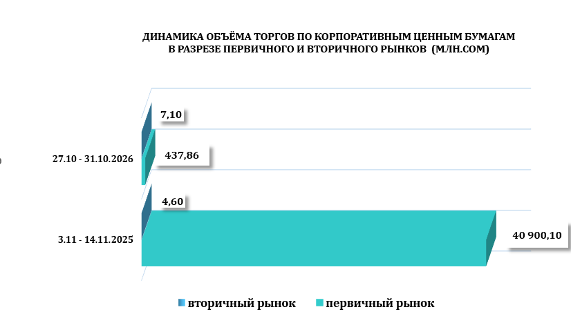 С 3 по 14 ноября 2025 года общий объем торгов на торговой площадке КФБ составил 40 904,70 млн. сом, было зарегистрировано всего 47 сделок с корпоративными ценными бумагами, основную долю объёма торгов заняли сделки с корпоративными ценными бумагами 100 %.