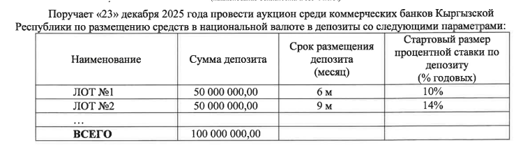 Российско-Кыргызский Фонд Развития объявляет аукцион среди коммерческих банков КР по размещению средств в депозиты на «23» декабря 2025 года со следующими параметрами: