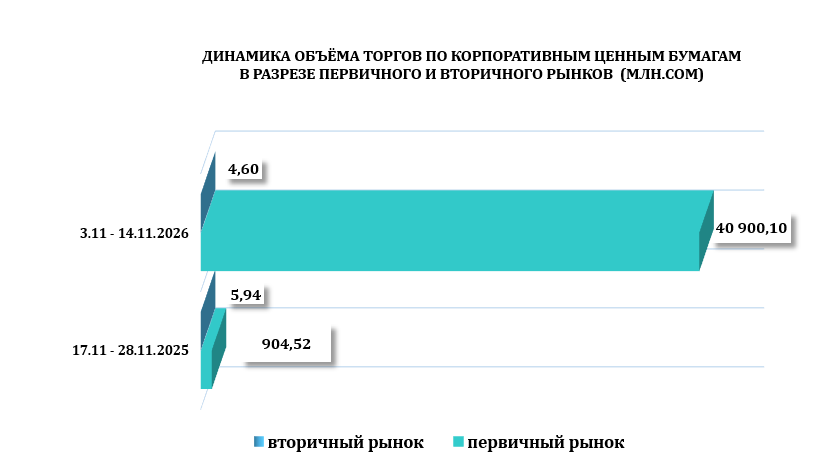 С 17 по 28 ноября 2025 года общий объем торгов на торговой площадке КФБ составил 1 129,36 млн. сом, было зарегистрировано всего 65 сделок с государственными и корпоративными ценными бумагами, основную долю объёма торгов заняли сделки с корпоративными облигациями 77,2 %.
