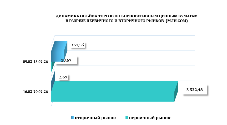 С 16 по 20 февраля 2026 года общий объем торгов на торговой площадке КФБ составил 3 664,76 млн. сом, было зарегистрировано всего 64 сделок с корпоративными и государственными ценными бумагами основную долю объёма торгов заняли сделки с простыми акциями компаний– 95,5%.