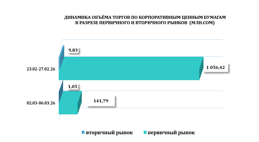 С 2 по 6 марта 2026 года общий объем торгов на торговой площадке КФБ составил 142,84 млн. сом, было зарегистрировано всего 11 сделок с корпоративными ценными бумагами основную долю объёма торгов заняли сделки с простыми акциями компаний– 99,8%.